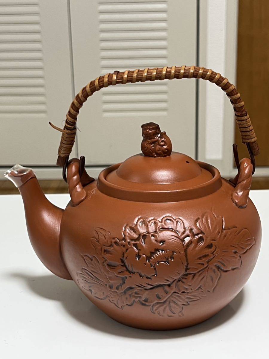 - 常滑焼 朱泥 土瓶 義仙造■急須 狛犬 花 茶器 茶道具 煎茶道具