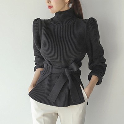 - 秋 冬レディース ニットセーター リブ編み リボン付き ハイネック オシャレ 暖かいDJ1009