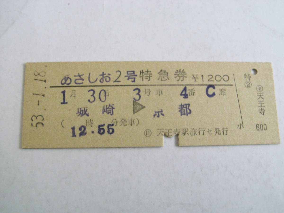 - あさしお2号 特急券 城崎→京都 昭和53年1月18日発行 日 天王寺駅旅行セ発行