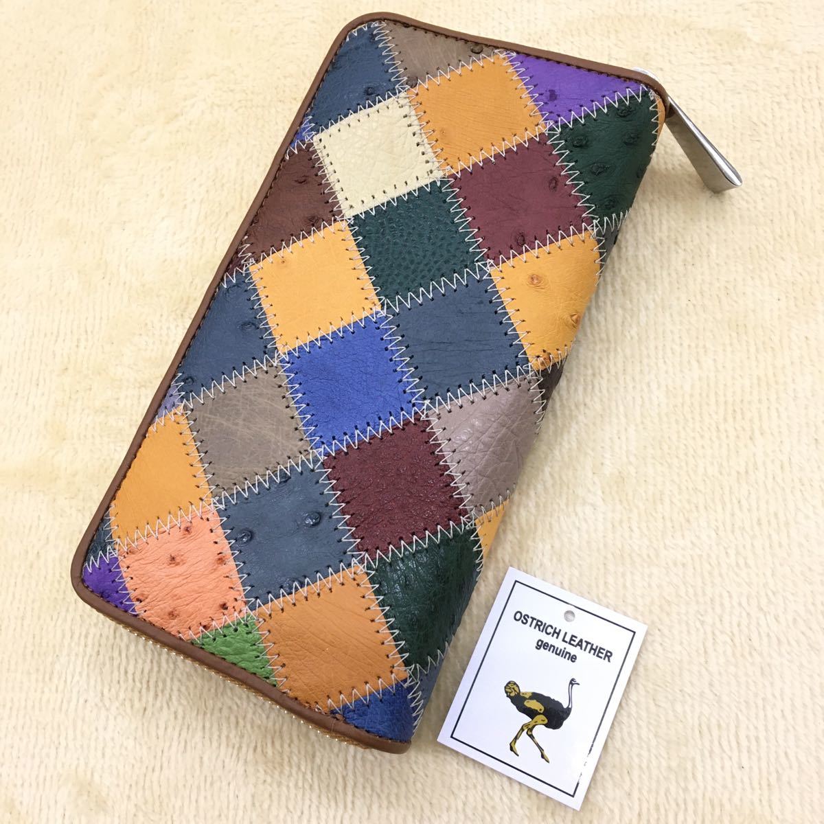 - エキゾチックレザー オーストリッチ ダチョウ パッチワーク マルチカラー ロングウォレット ラウンドファスナー 革 ラウンド 未使用