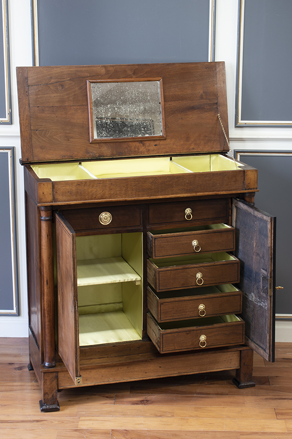 扉を閉めた様子は一見シンプルなキャビネットですが、天板は上に開いてミラーと仕切り収納(ドレッサー)、そして扉を開ければ中には細かな収納ができる引き出しと棚、本体一番下にも一枚の大きな引き出しが取り付けられ、これでもかと実用性を追求されたお品であることがわかります。