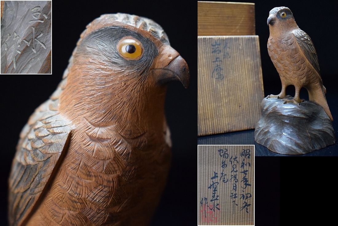 - 小禽木彫の天才【初代 上野玉水(蝸牛庵)】木彫『岩上鷹』置物 昭和七年 共箱