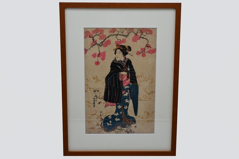 > 作者不明 ■ 美人画 *着物柄 稀 錦絵 浮世絵 コレクター整理品 ■ 木版画 額入り 布袋 紙箱入り №9521■