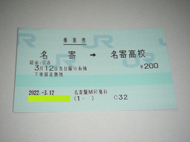 - 【JR北海道】名寄駅発行 2022.3.12 名寄→名寄高校 片道乗車券マルス券1枚【新品未使用】