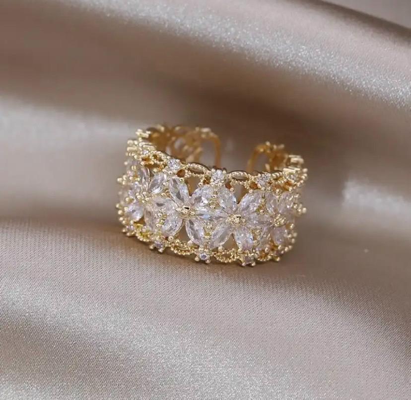 > 721★新品未使用★レディース ゴールドリング czダイヤモンド フラワー 花 オープン ドレス 真珠 ジュエリー アクセサリー 結婚式 ストーン