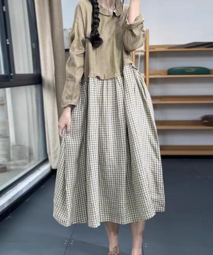 - 秋新品 *リネンワンピース マキシワンピース 綺麗 チェック柄 切り替え 長袖 ロングワンピース 大きいサイズ きれいめ 体型カバー