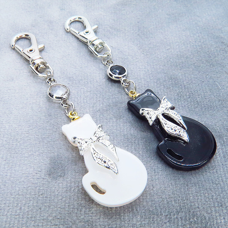 - シルバーカラーリボン付きの猫シルエットモチーフとラインストーンのキーホルダー 白黒色選択 金具変更可