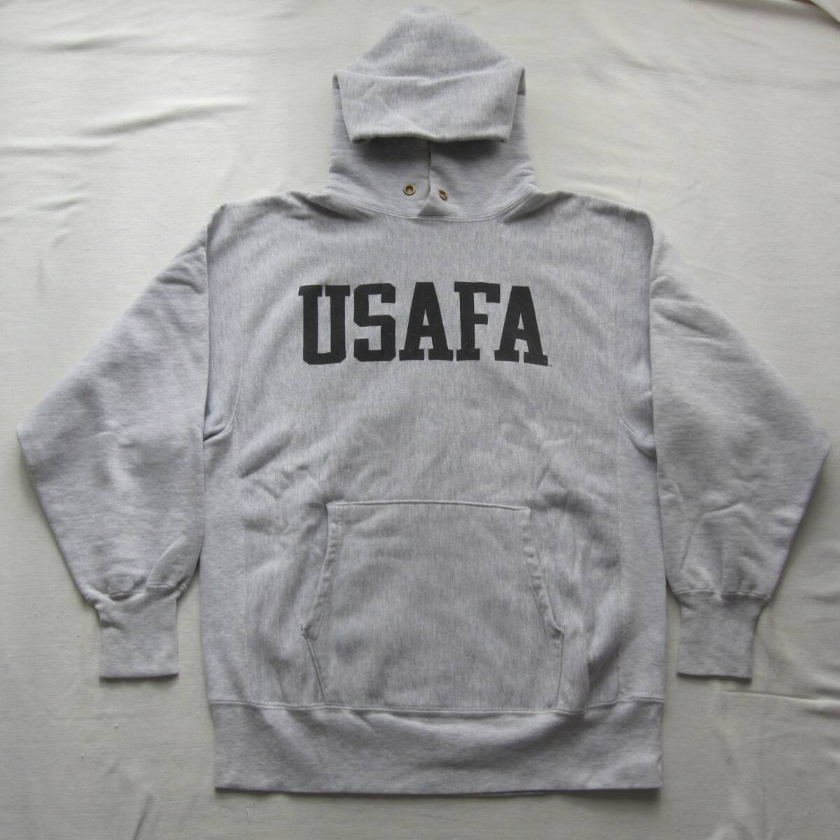 > ☆ 90s チャンピオン USAFA リバースウィーブ パーカー (XL) 刺繍タグ ヴィンテージ / トリコタグ 単色 タタキタグ USMA NAVY 染み込み
