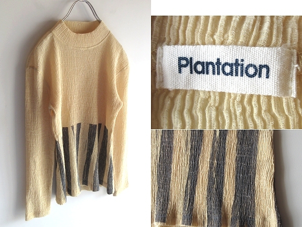 > Plantation プランテーション 楊柳 シワ加工 ウール プリントデザイン モックネック カットソー ロンT 長袖Tシャツ M ベージュ プリーツ