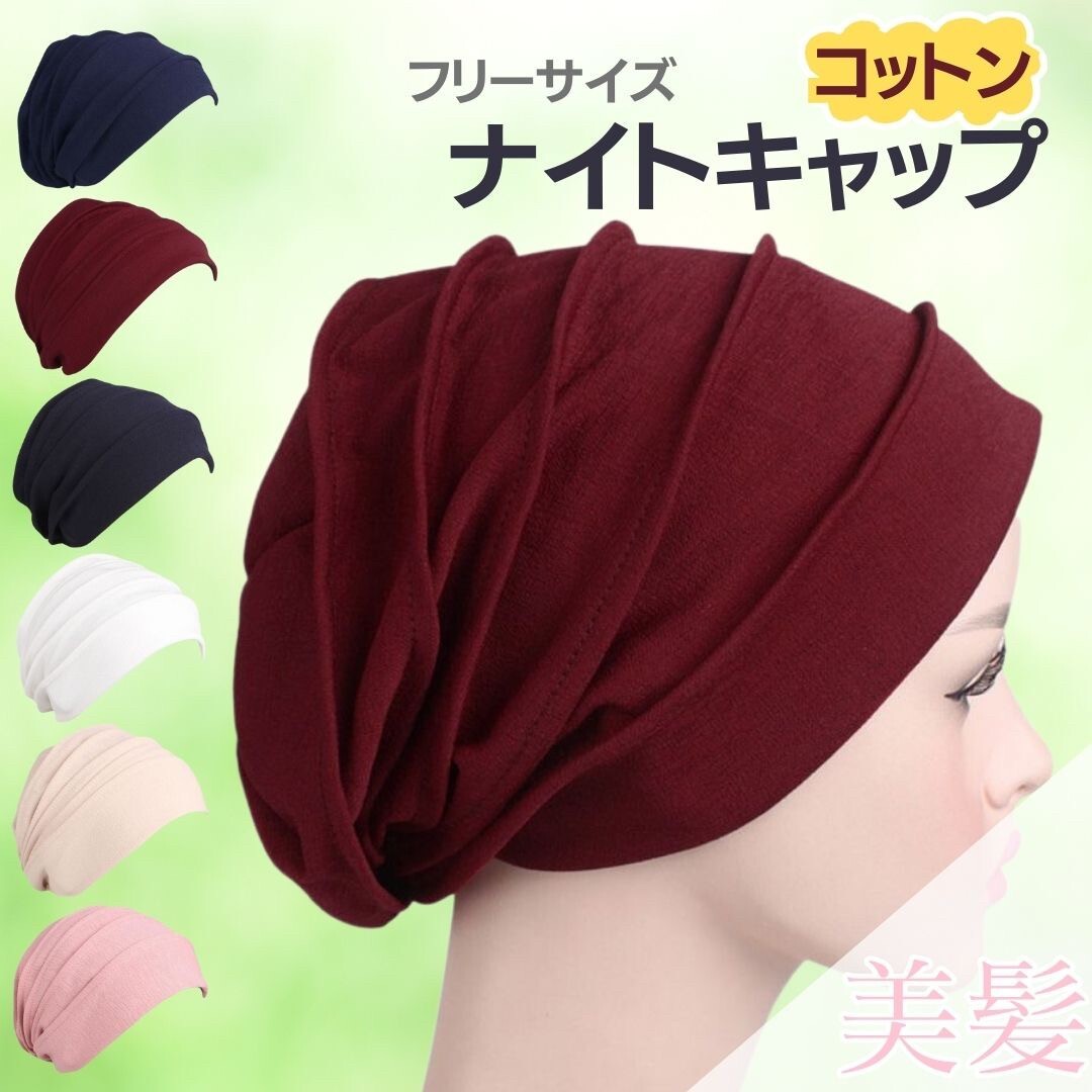 > 【ネイビー】睡眠用 ニット帽風 ナイトキャップ コットンポリエステル 選べる6カラー ヘアキャップ 髪 包み 巻き 上部 お手入れ
