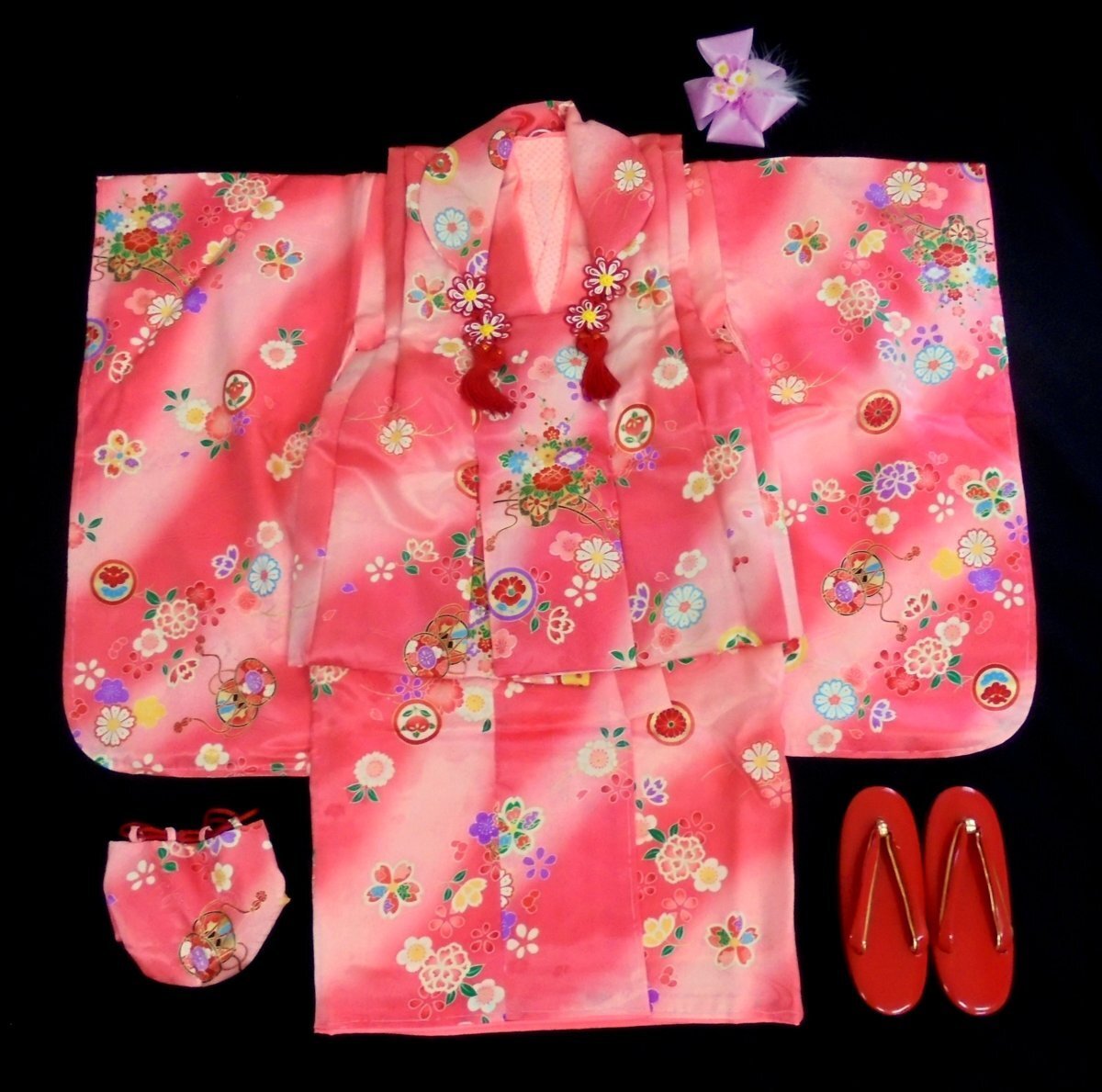 > 5613 七五三 正絹 被布セット 3歳 女の子「赤紅・桜/花車/鼓」