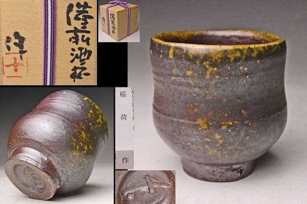 - 稲荷作 ★ 備前窯変ぐい呑 ★ 共箱栞 ★ 酒器 ★ 検索: 盃 杯 紫蘇色 自然釉