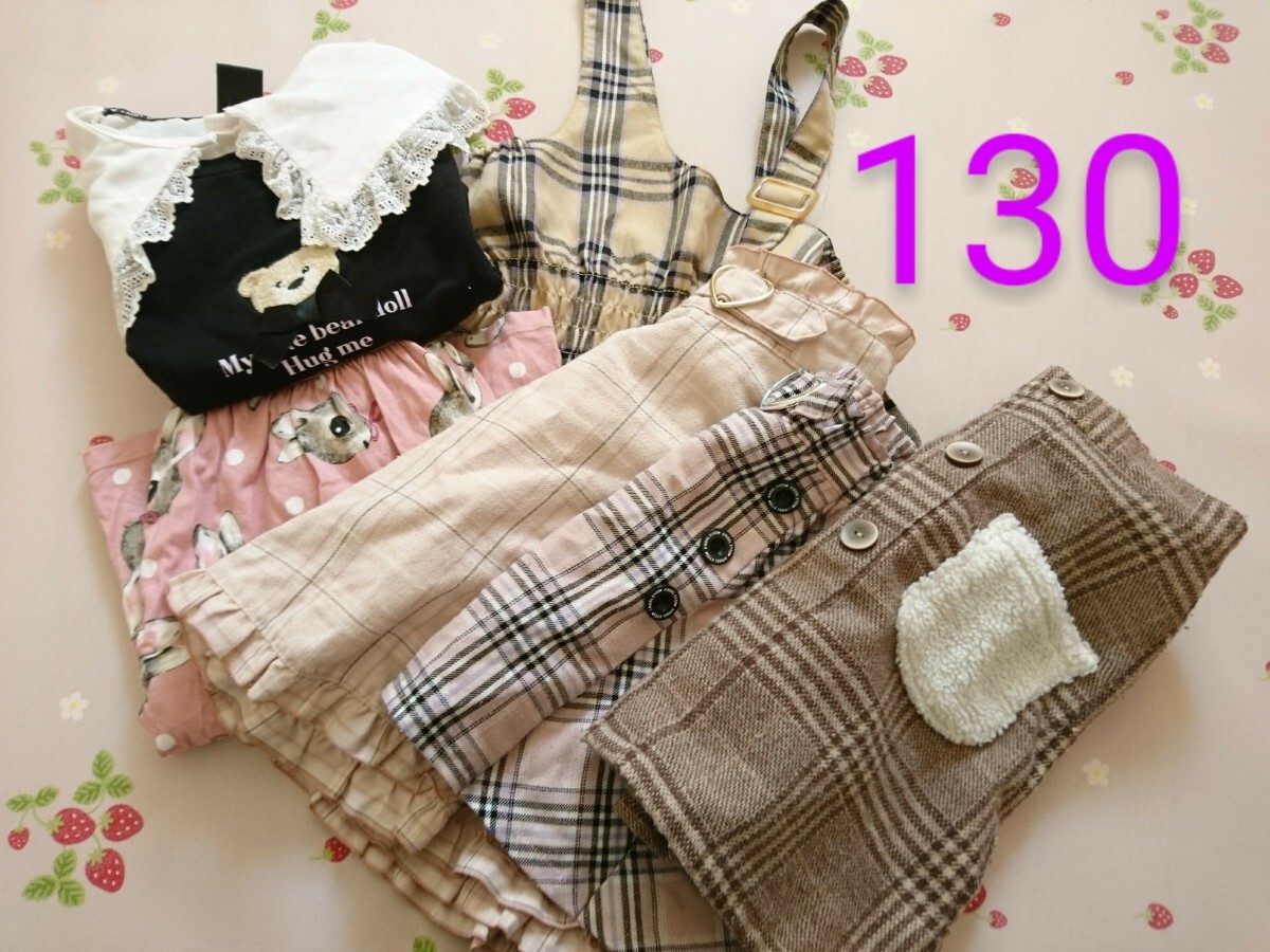> 130 女の子 ワンピース スカート ナチュラル ガーリー セット売り まとめ売り 黒 くま チェック ピンク