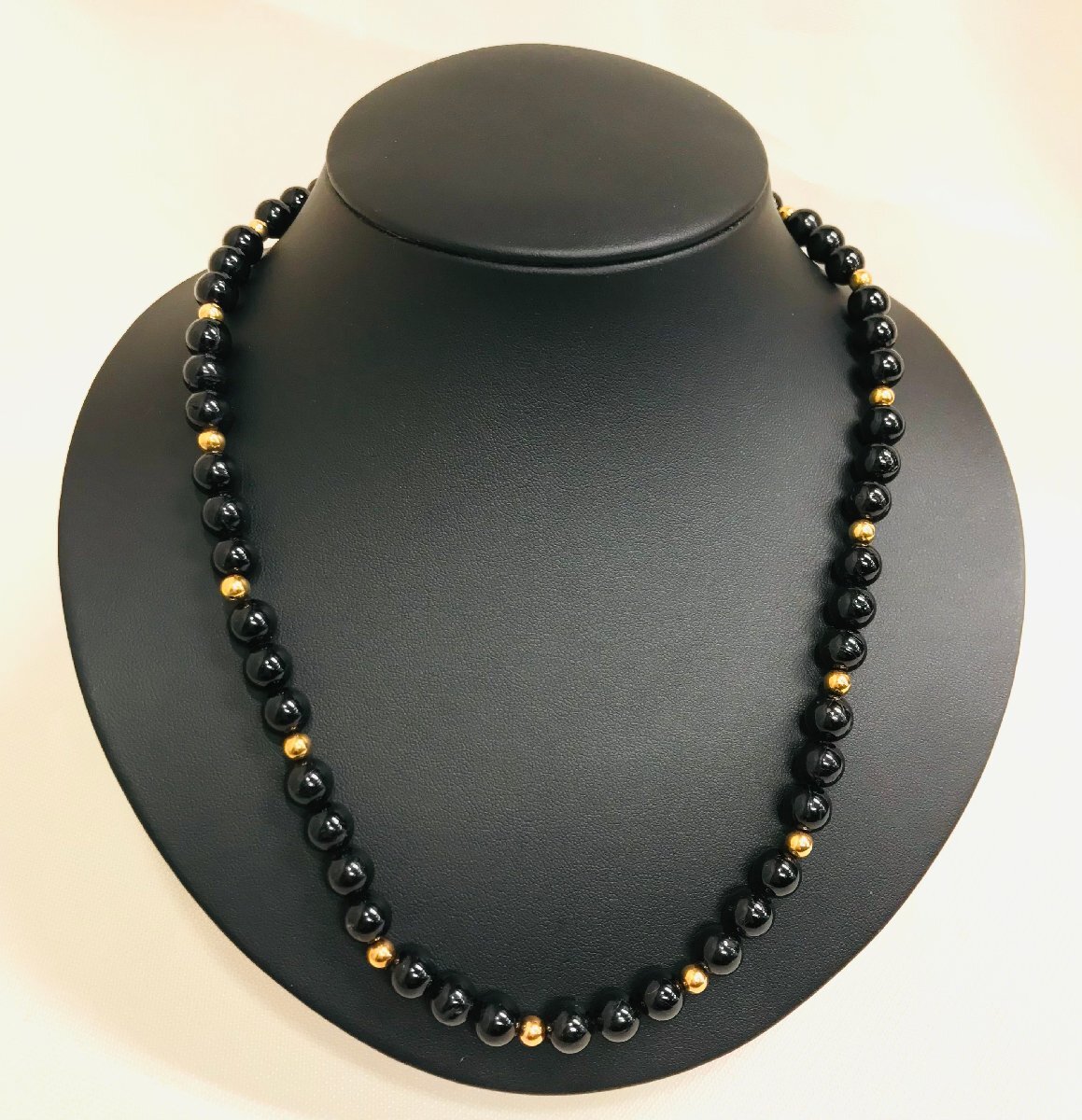 - K18ゴールド 天然トルマリン ブラック 丸玉ネックレス 8.0mm×4.0mm玉 ソーティング付き qoj.YO603