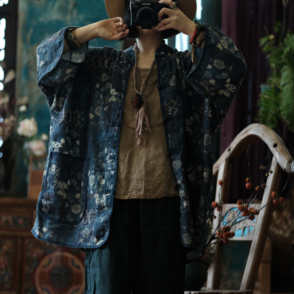 - 上質 カーディガン 花柄 チュニック 襤褸 アンティーク風 洋服ミックス ロマンファッション ポップ ゆったり 麻100% RINENリネン