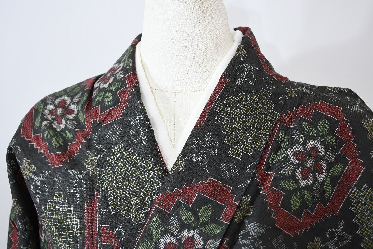 - 大島紬 花 亀甲 身丈159cm 裄丈67cm ★着物 pb-2710 桜庭呉服店