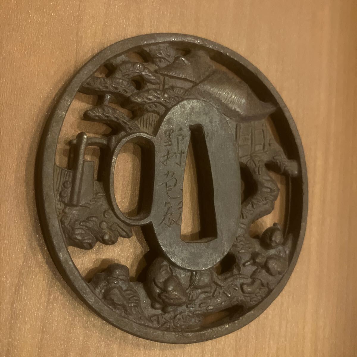 - 骨董 野村包教 牛飼風景図透かし 鉄地鍔 鍔 銘あり 蚤の市 刀 刀装具 JAPAN サムライ 侍