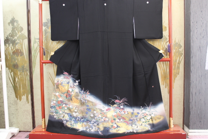 - きもの今昔6948 黒留袖紋付 正絹高級加工品 庭園草花と鶴の金駒刺繍柄 正絹比翼付き 身丈158cm