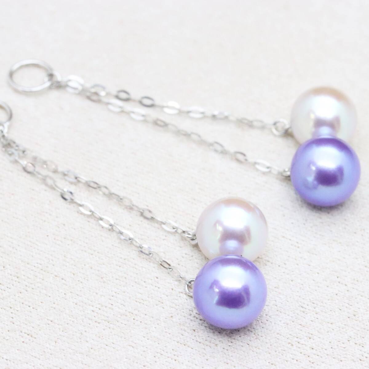 - ピアスチャーム K18WG パール 真珠 チェーン ダブルパール バイカラー パープル ホワイト /24-105S