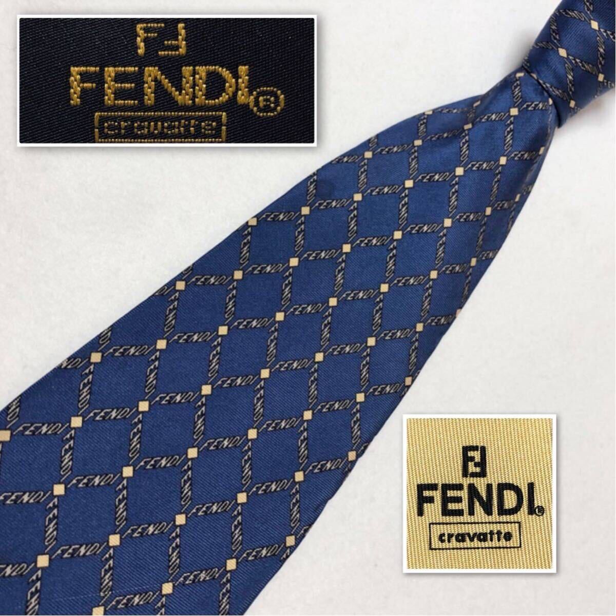 - FENDI フェンディ ネクタイ ロゴ 格子 総柄 シルク100% イタリア製 ブルー系 ビジネス