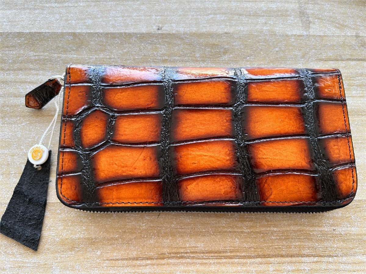 - QB オレンジ色 腹革 人工養殖 未使用 ダブルファスナー 一枚革 本物 ワニ革 アリゲーター・ 長財布◆手染 クロコ メンズウォレット 紳士