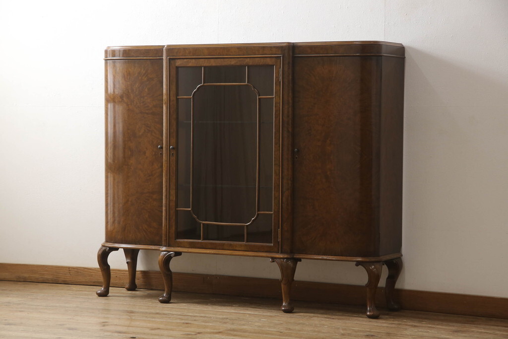 - R-065592 イギリスアンティーク 高級品 Lloyd’s Antiques取り扱い ウォールナット バーズアイ(鳥眼杢) 薄型 猫脚サイドボード
