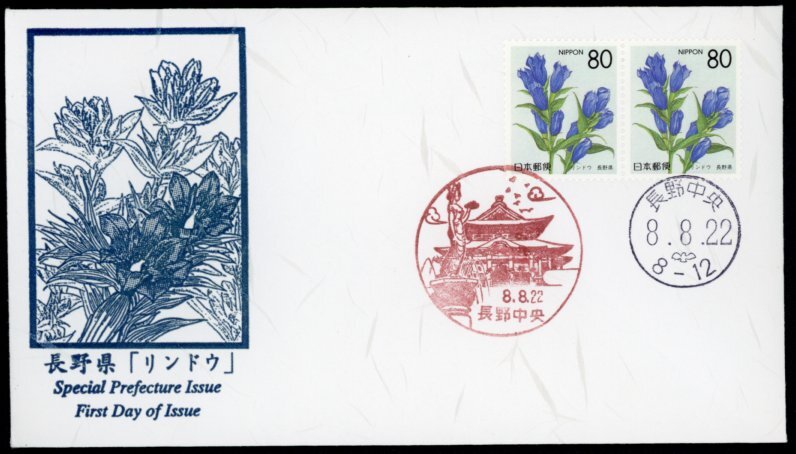 - 0871 【FDC】ふるさと 長野県「リンドウ」[長野中央/8.8.22/鳴美版](解説書なし)