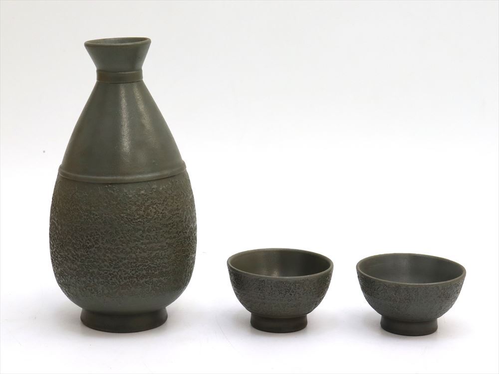- 【No1290蔵出し】 『 青備前焼 森製 徳利 酒盃2客 骨董品 アンティーク』
