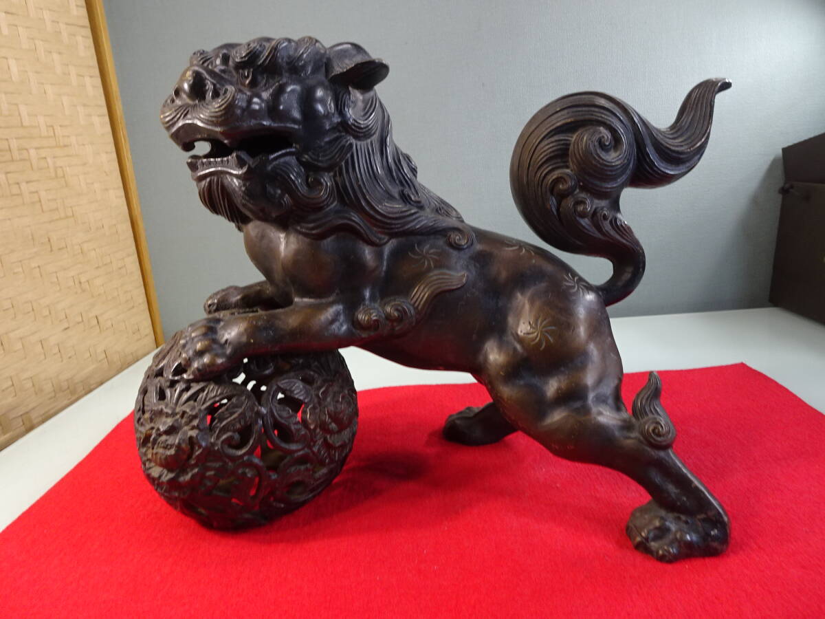 - 大きな 玉獅子 赤獅子 獅子舞 狛犬 玉乗り獅子 シーサー 縁起物 魔除け 開運 置物 15kg弱 中古