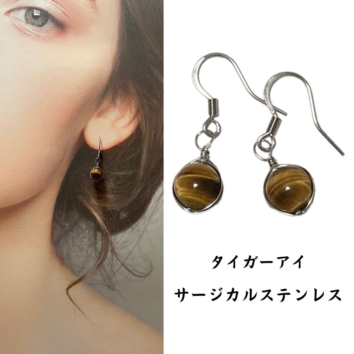 - W64. 天然石 ピアス タイガーアイ サージカルステンレス アレルギーフリー ニッケルフリー ハンドメイド