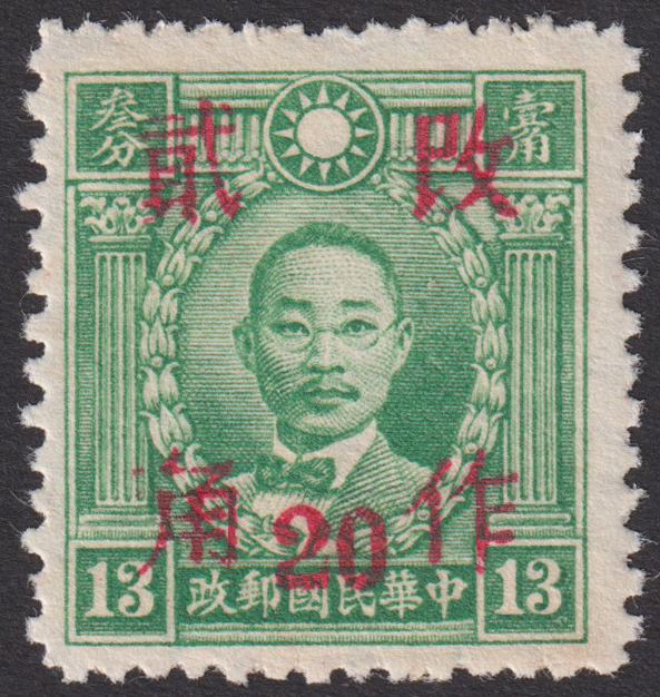 - 旧中国切手 1943年2月 改作二角(20分)票 湖南 香港版烈士すかし有 13分 未使用 JPS:708 Chan:692 1422