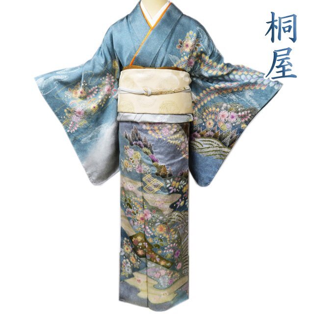 > 特選 訪問着 着物 中古 正絹 フォーマル 桐屋 翠山工房 辻が花 絞り 銀通し 多色 身丈170cm 裄66cm L トール きもの北條 A1019-3