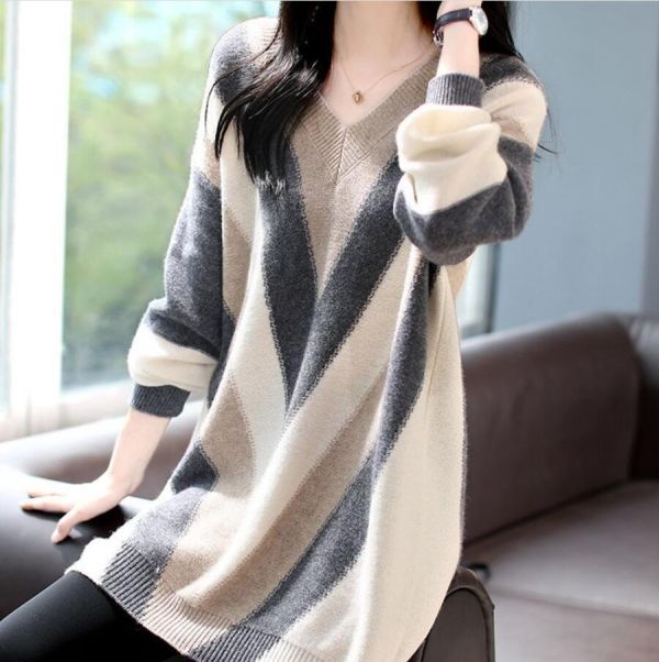 - 新品 / オシャレ Vネック ボーダー柄 ニットセーター ミンクカシミヤ混 柔らかい 暖かい 長袖 ニットトップス ワンピース 20代 30代 40代/