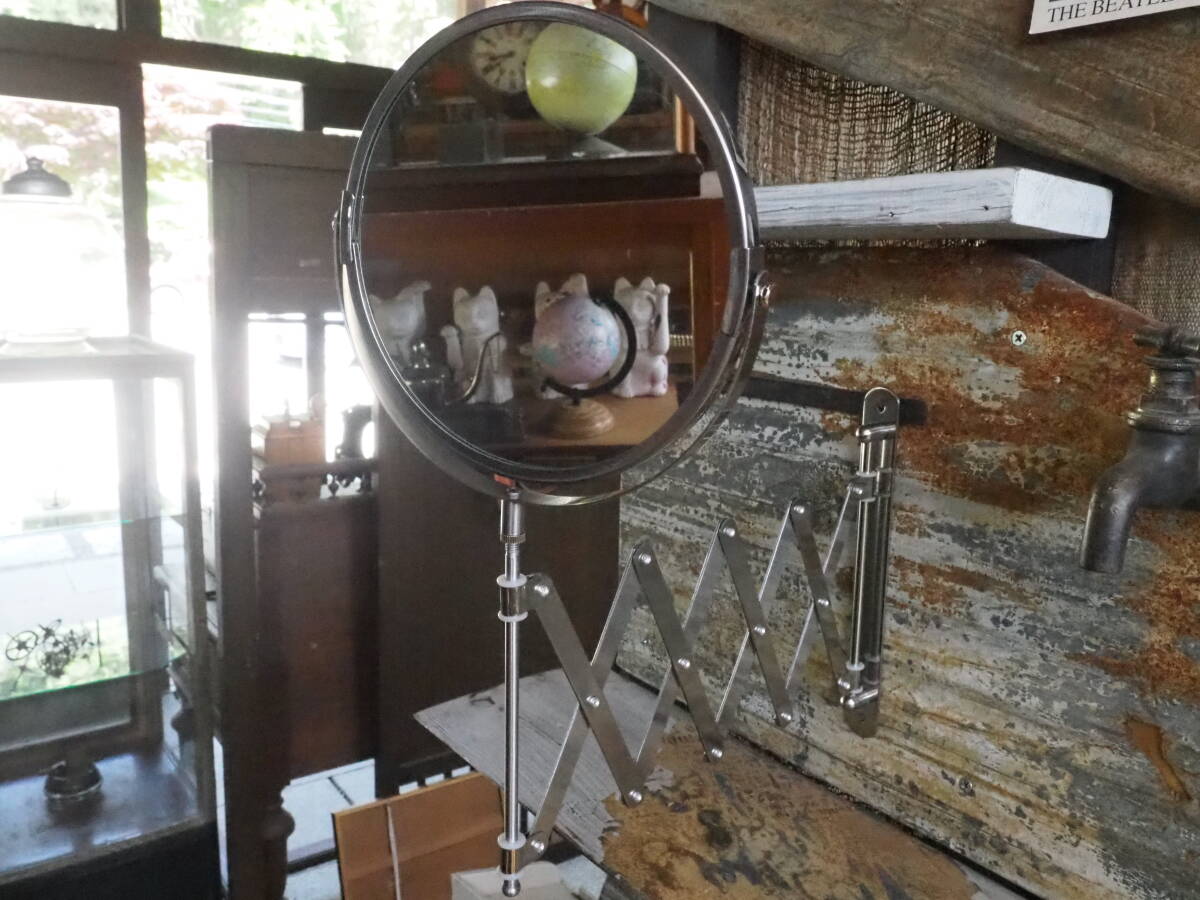 - 【蛇腹フックの両面鏡】ミラー拡大鏡美品洗面台トイレ服飾品アンティーク化粧鏡インテリア美容院古道具インダストリアル骨董