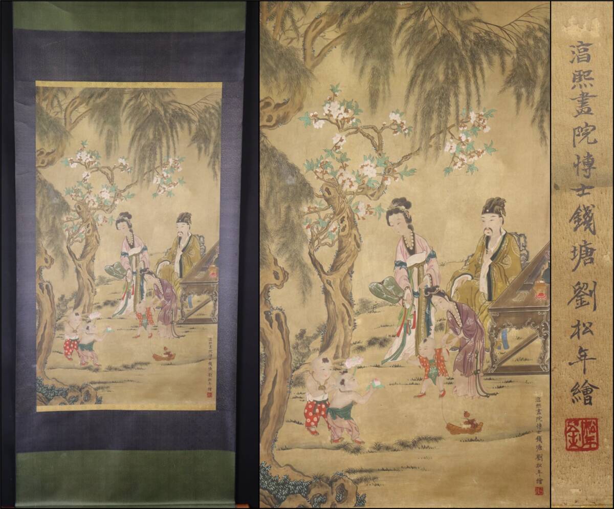 - 古美術 掛け軸 中国・宋時代 「 劉松年書」 絹本 【教子図】 立軸 書道 巻き物 真筆逸品 肉筆保証 唐物 古画 LT-24619