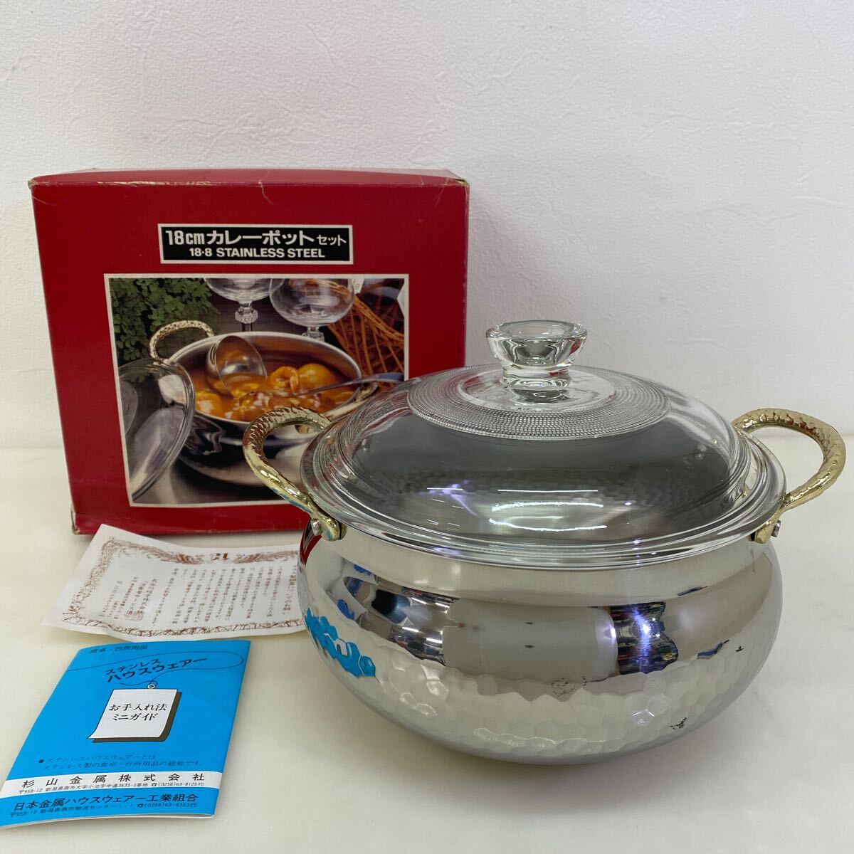 > 515 中古 18cmカレーポット 18.8ステンレススチール 両手鍋 ガラス蓋付 昭和レトロ ステンレス鍋 当時物 昭和キッチン