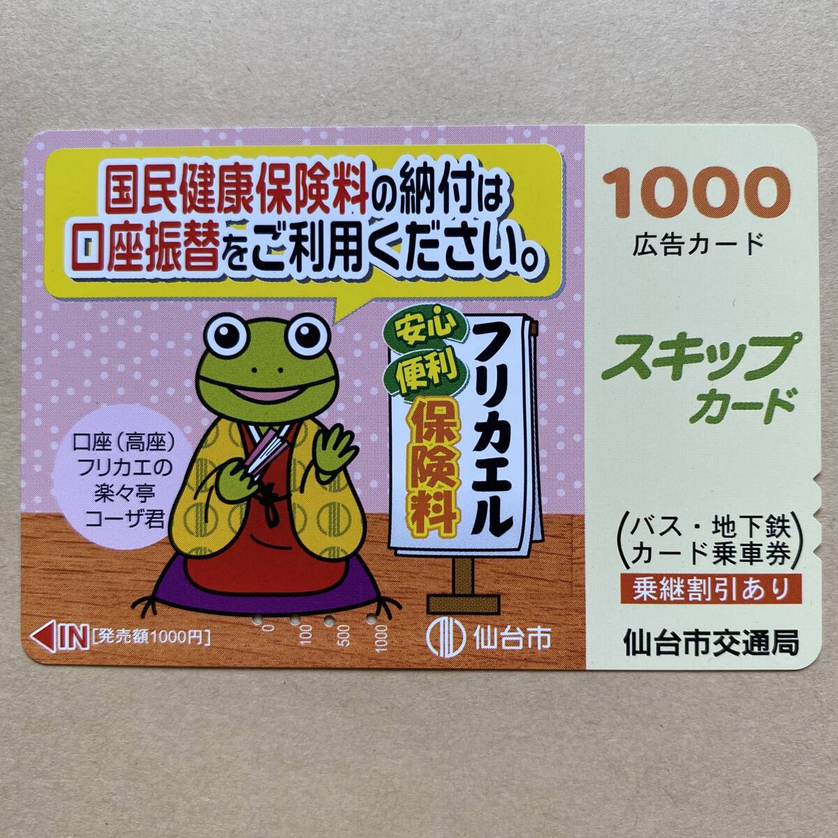 - 【使用済】 スキップカード 仙台市交通局 国民健康保険料の納付は 口座振替をご利用ください。口座(高座) フリカエの 楽々亭 コーザ君