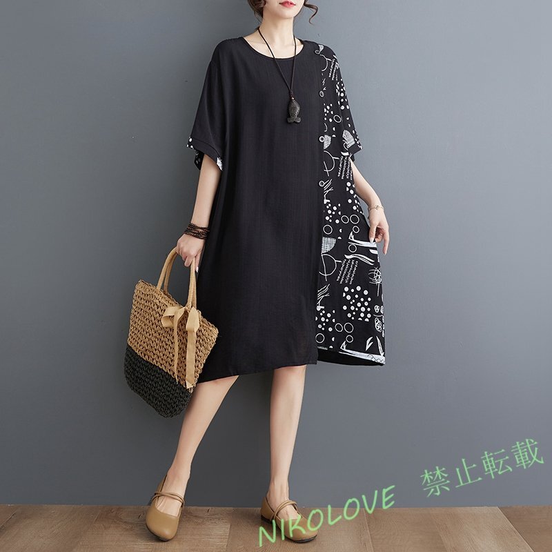 - 新品森ガール チュニックワンピ 半袖 綿麻 プリント柄 切り替え 体型カバー きれいめ おしゃれ 復古風 ひざ丈ワンピース~ブラック LE508
