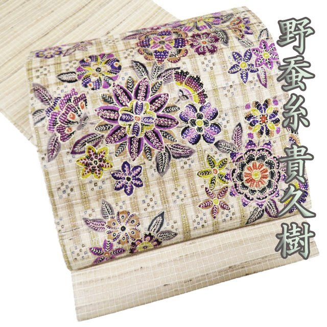 > 特選 袋帯 中古 正絹 カジュアル 仕立て上がり お太鼓柄 野蚕糸 貴久樹 手織 花模様 ラベル付き 砂色 多色 金 きもの北條 A1033-14