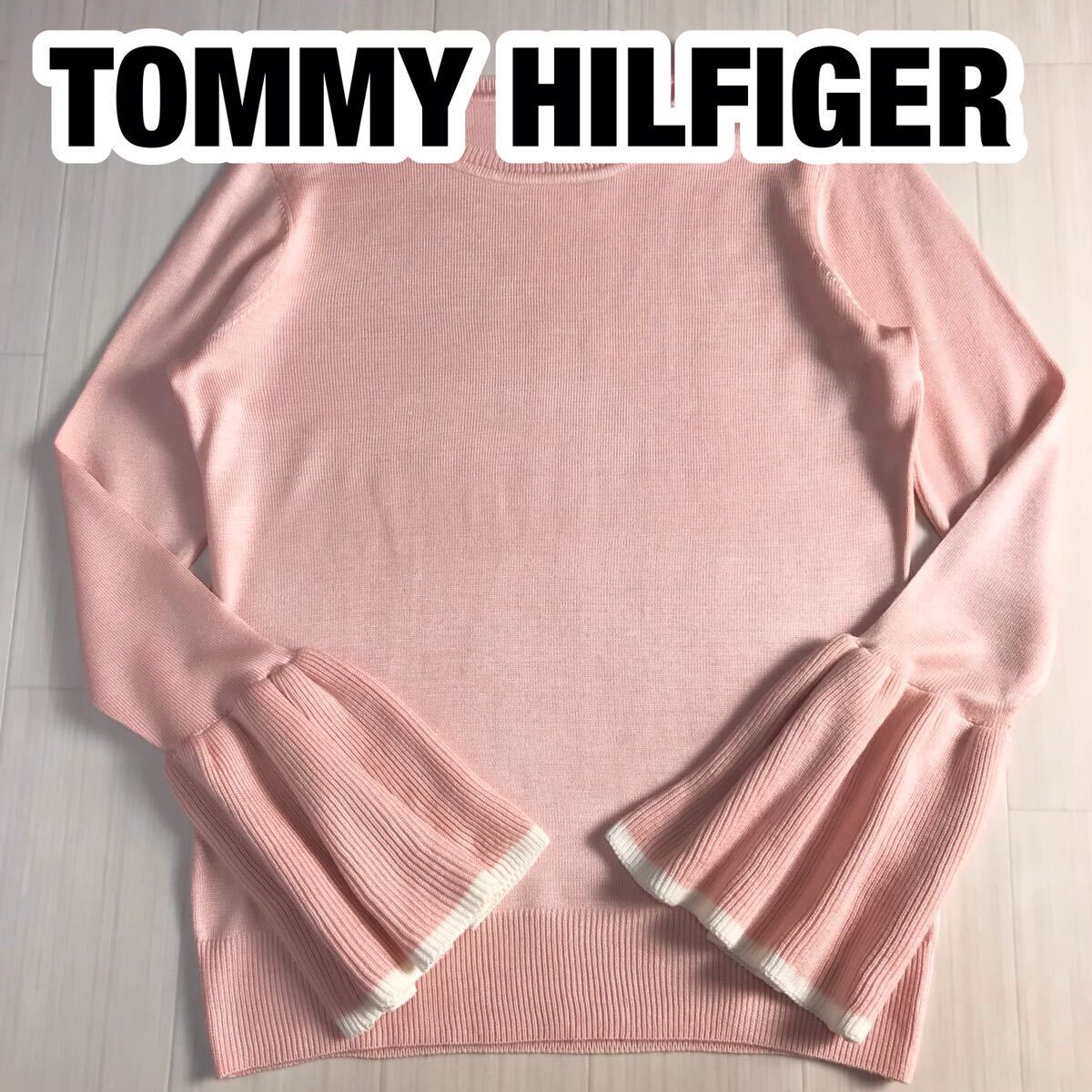 > TOMMY HILFIGER トミー ヒルフィガー デザインニット XS ピンク×ホワイト フレア プレートロゴ 薄手 セーター