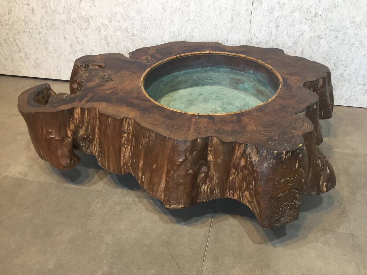 > 『 木製火鉢 切根 』A1 火鉢 大型火鉢 囲炉裏 手あぶり 灰付き テーブル 天然木 無垢 杉? 切株 レトロ 二個口発送 ★古時家★