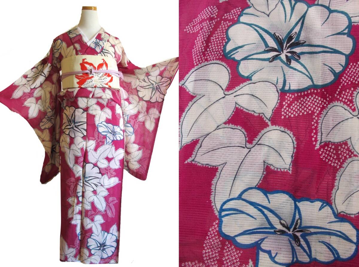 - 大輪の朝顔に葉 アンティーク絽着物 大正ロマン 絽ちりめん 絽縮緬