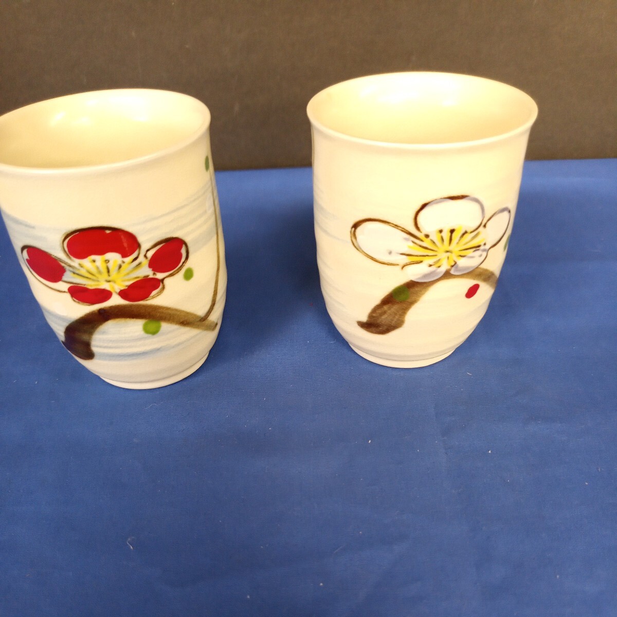 - 昭和レト 九谷焼 紅白梅柄 ペア湯のみ 食器 花柄