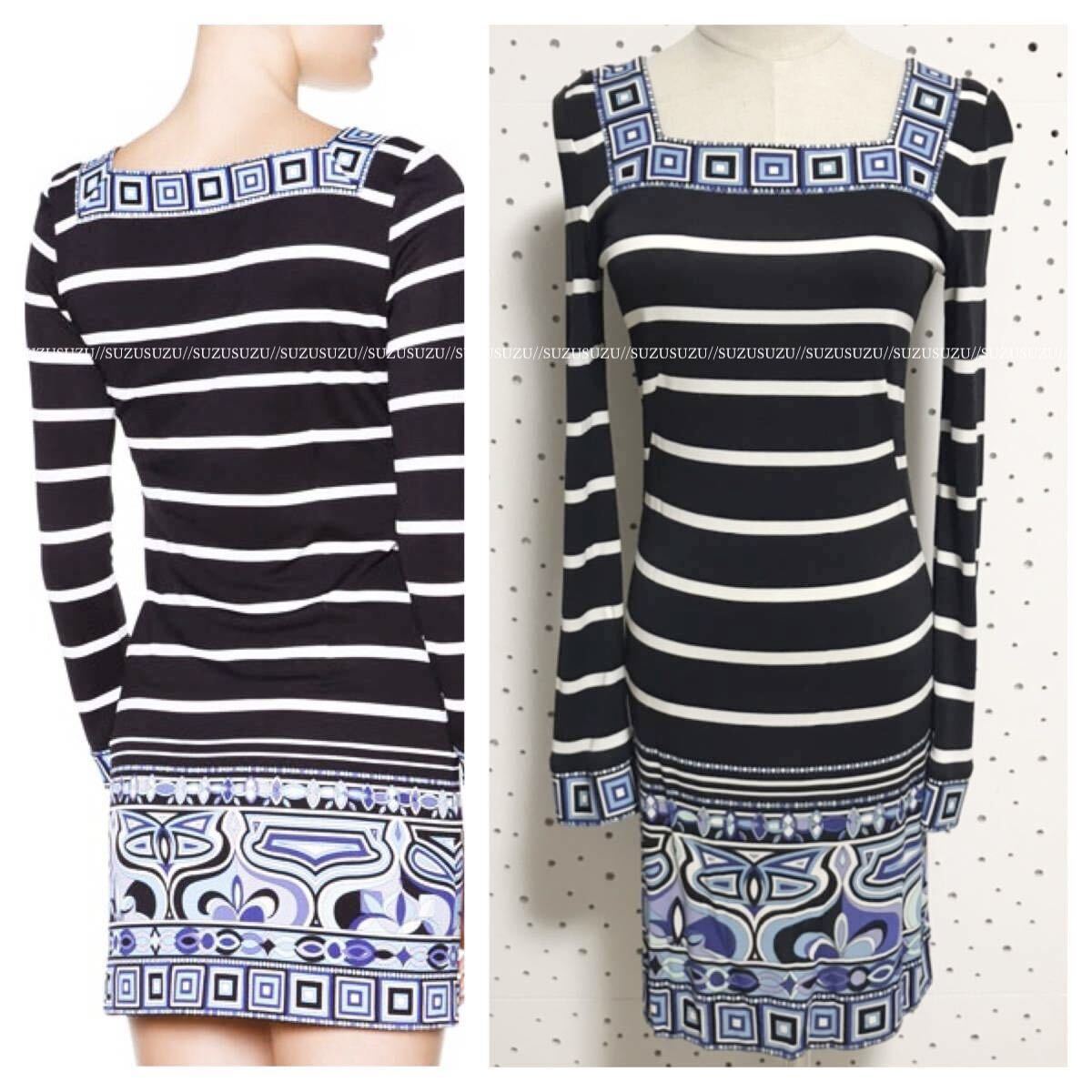 > 本物 名作 エミリオプッチ ボーダー アートデザイン シルク混 長袖 ワンピース ドレス 40 黒×白系×ブルー系マルチカラー EMILIO PUCCI