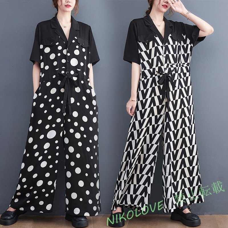 - 新品夏物 オールインワン オーバーオール 切り替え バイカラー 体型カバー 着痩せ シンプル フリー ドット柄 LC149