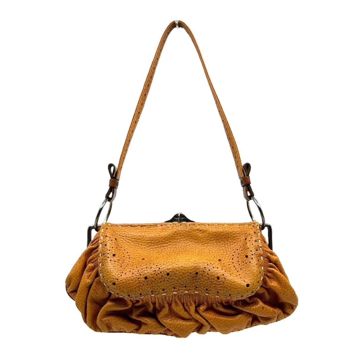- 美品 ジャマンピュエッシュ がま口 ショルダーバッグ ハンドバッグ チャーム ブローチ付き 茶系 24F23-B1