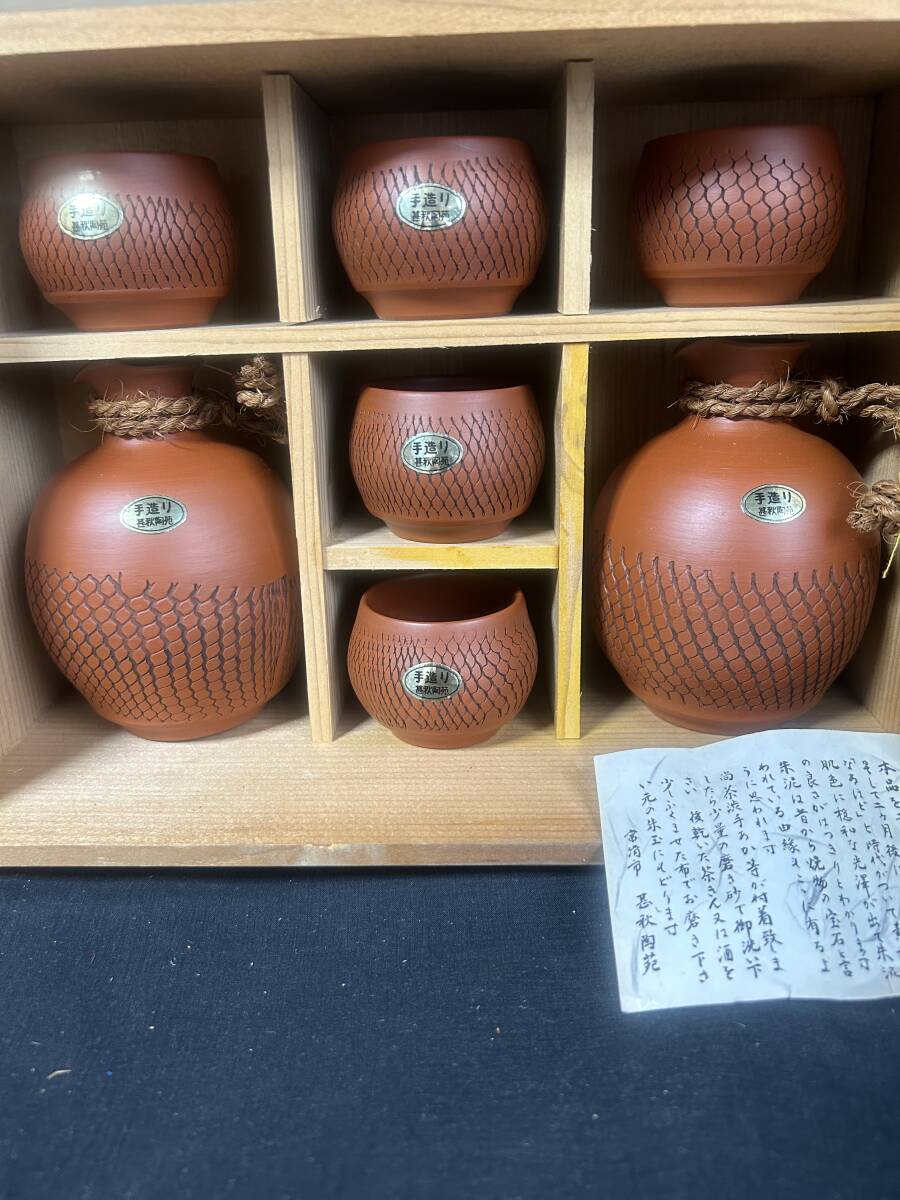 > D 514 未使用 手作り 酒器 徳利2個 盃5個 セット 竹 常滑焼 朱色 酒器揃 自宅保管品
