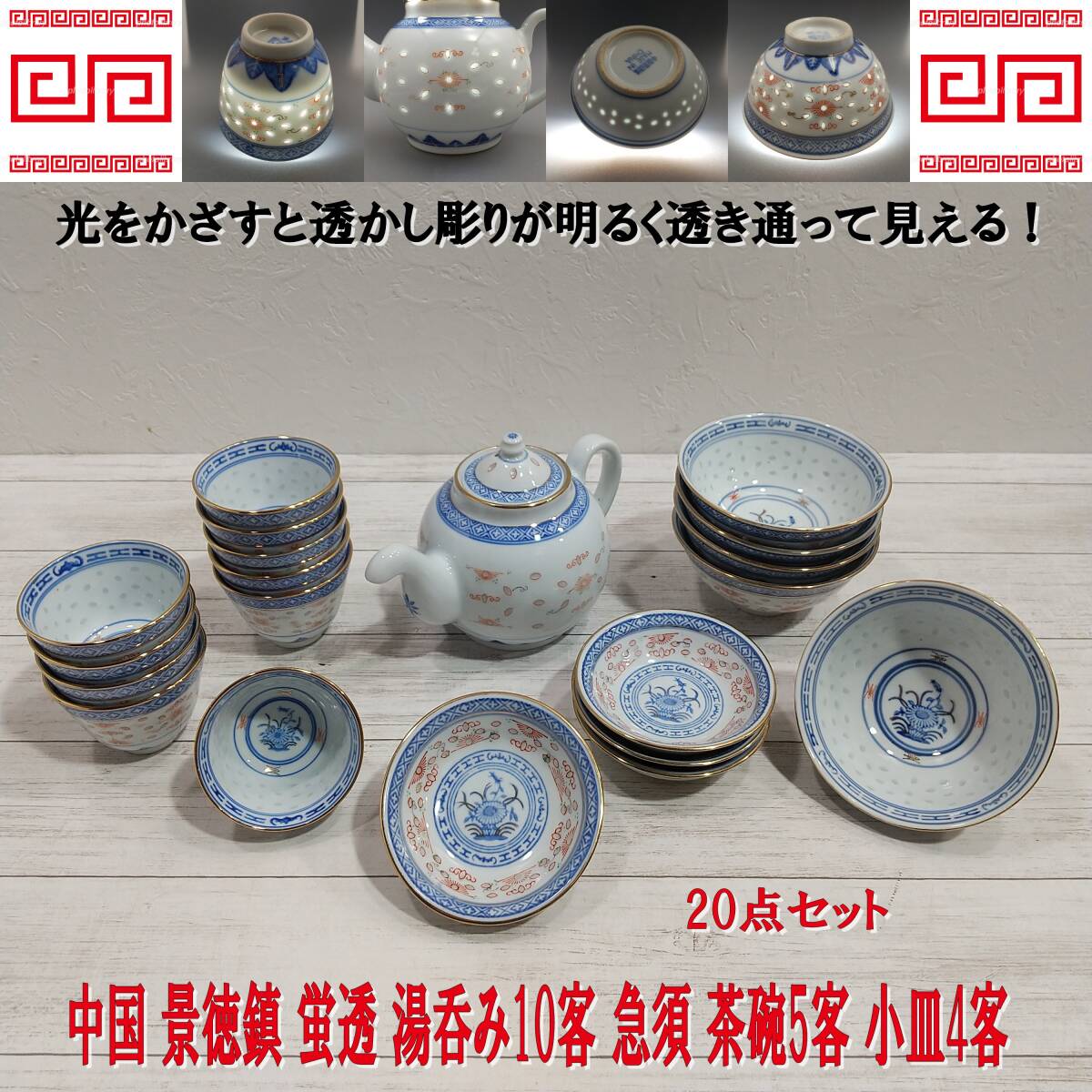 中国 景徳鎮 蛍透 湯呑み10客 急須 茶碗5客 小皿4客 まとめて
