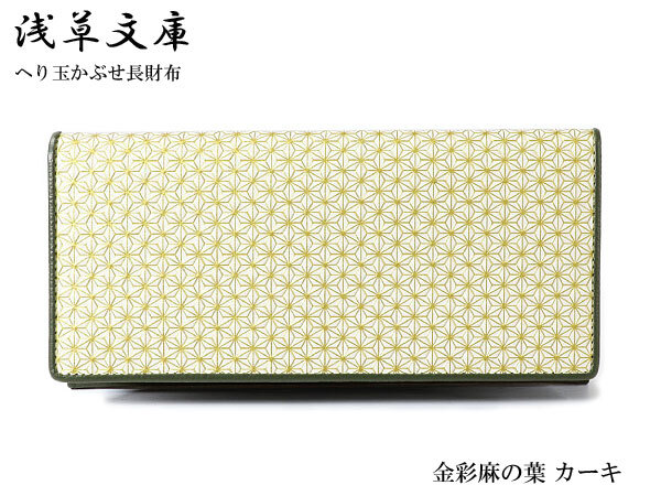 - 財布 へり玉かぶせ 長財布 浅草文庫 麻の葉 カーキ 小銭入れあり 日本製 友禅染 本革 江戸小紋 金彩 麻の葉
