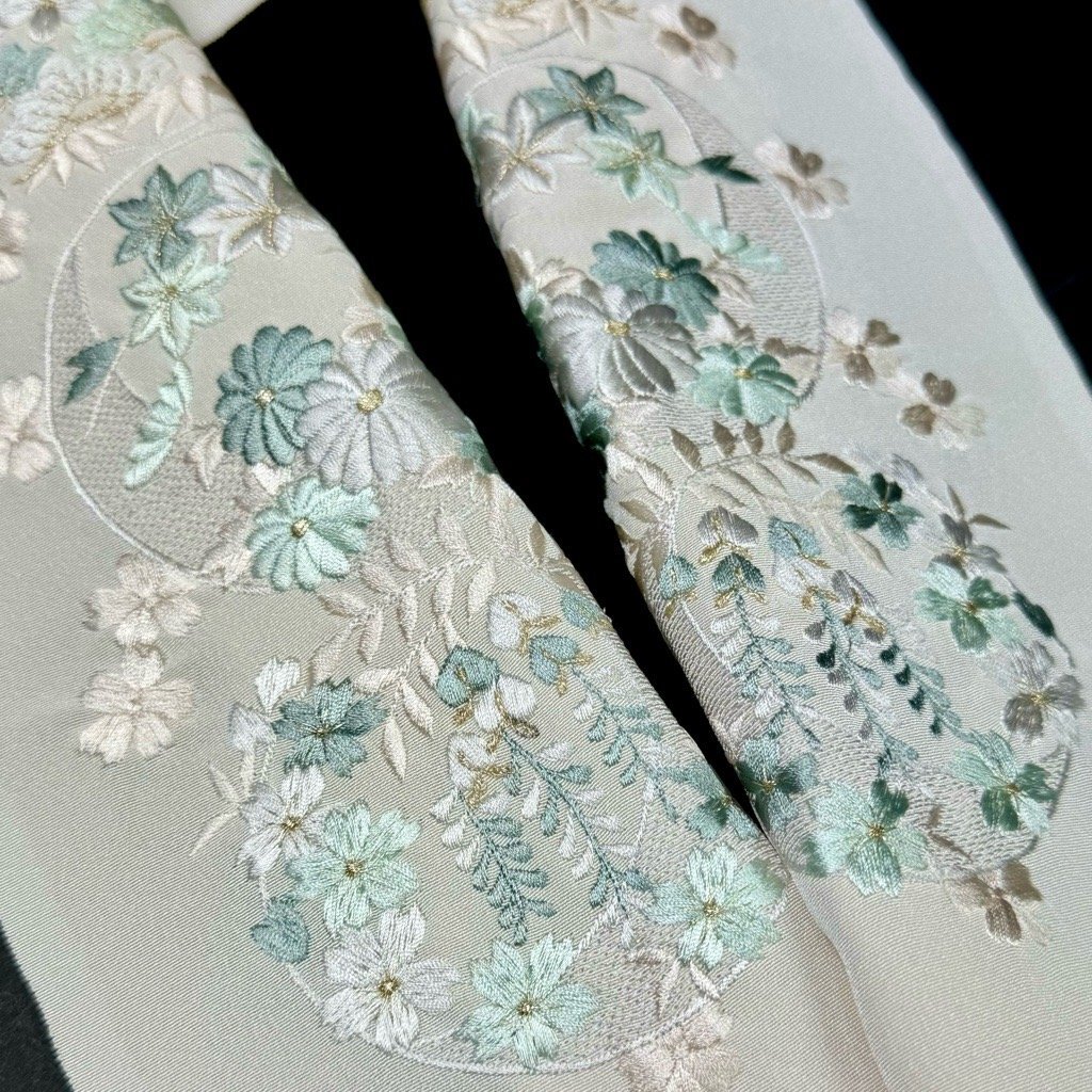 - 着物さと ② 新品 絹交織 豪華 刺繍 半襟 アイボリー 花丸文様 四季の花 水色 くすみ 白 金 成人式 振袖 袴 訪問着 フォーマル 未使用 美品
